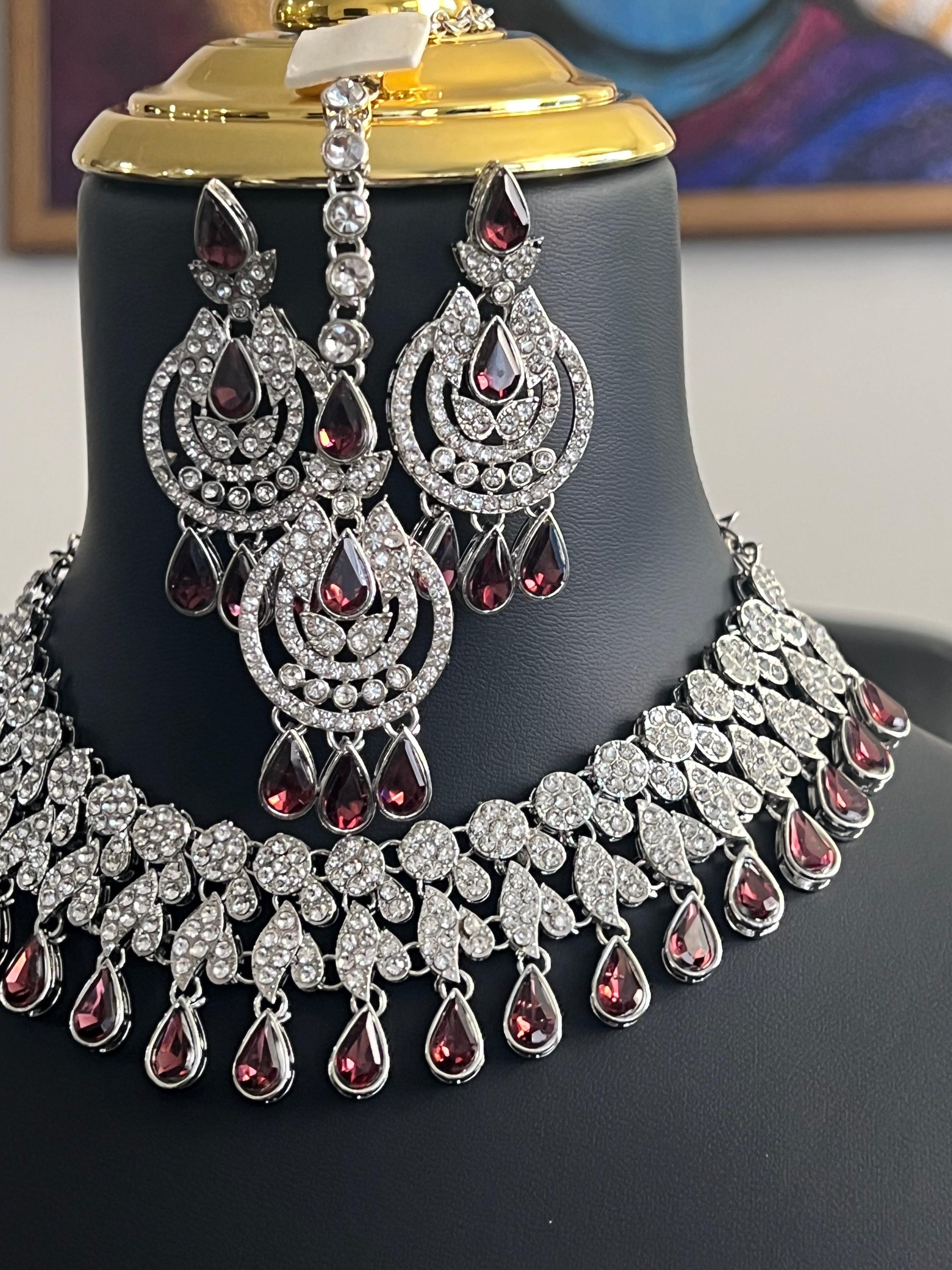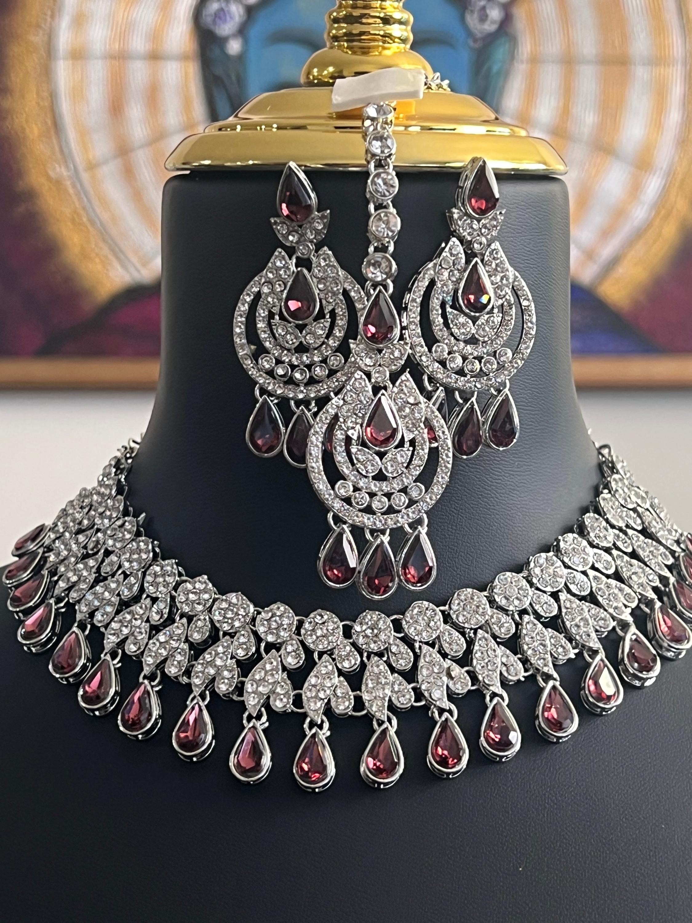 The Wine Wonder necklace set features a striking wine color complemented by a traditional Teeka for added elegance. Crafted with silver and glass beads, this set offers a sophisticated accessory option suitable for various occasions, enhancing both formal and casual attire.