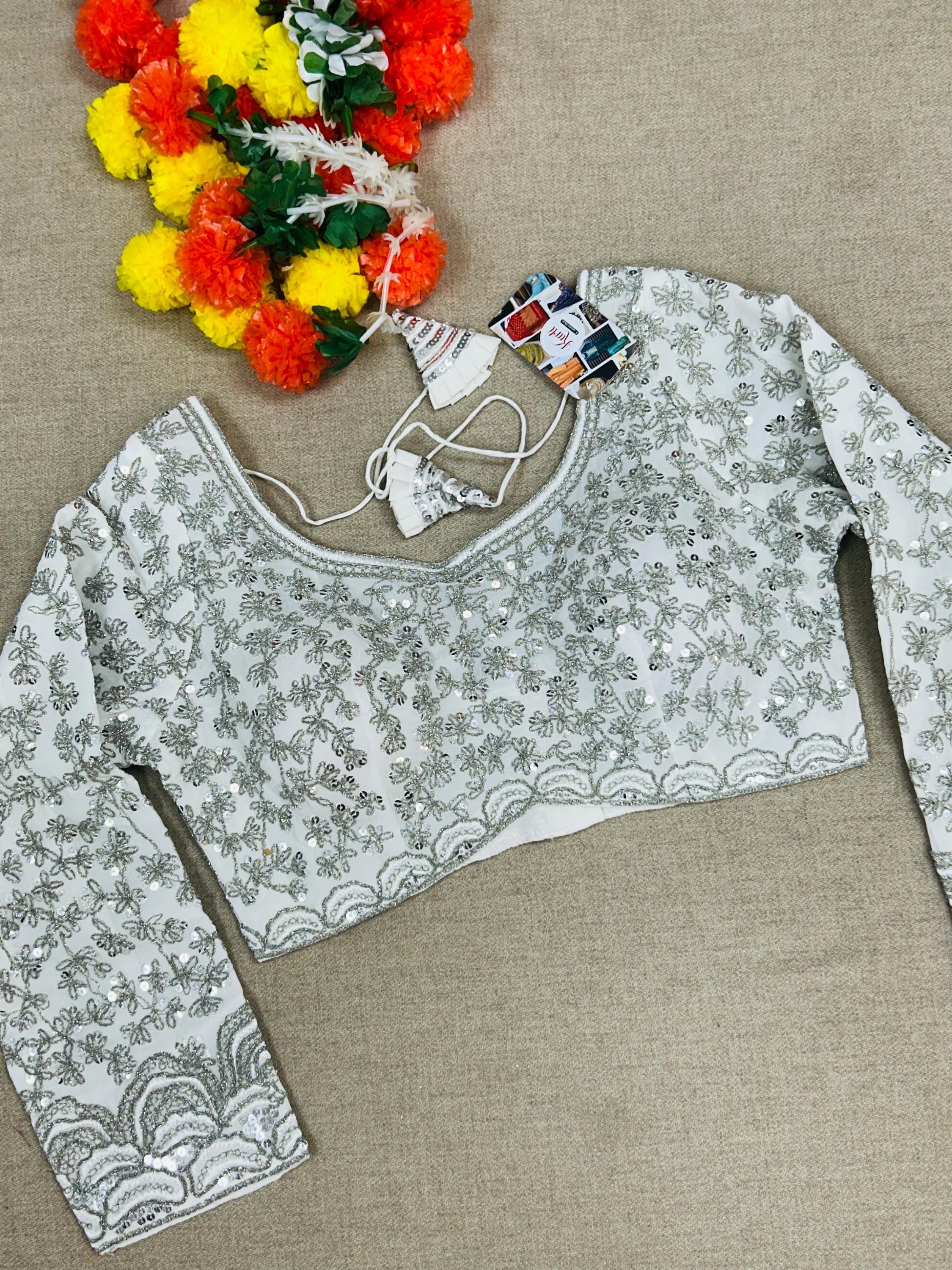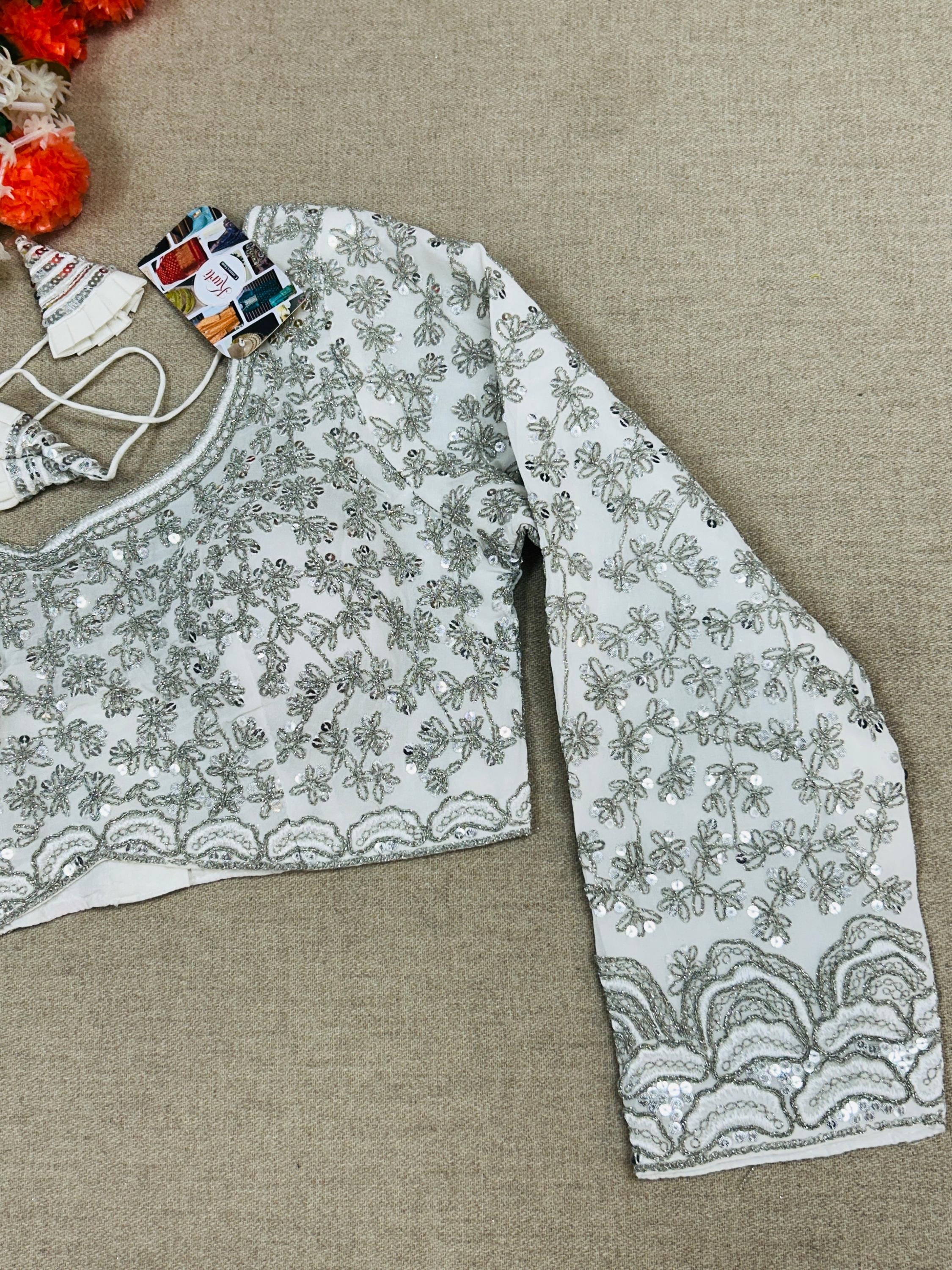 This silver work blouse exudes elegance and style with its full sleeve design. Made from high-quality silver material, it adds a touch of sophistication to any outfit. You can never go wrong with this versatile and timeless piece in your wardrobe.