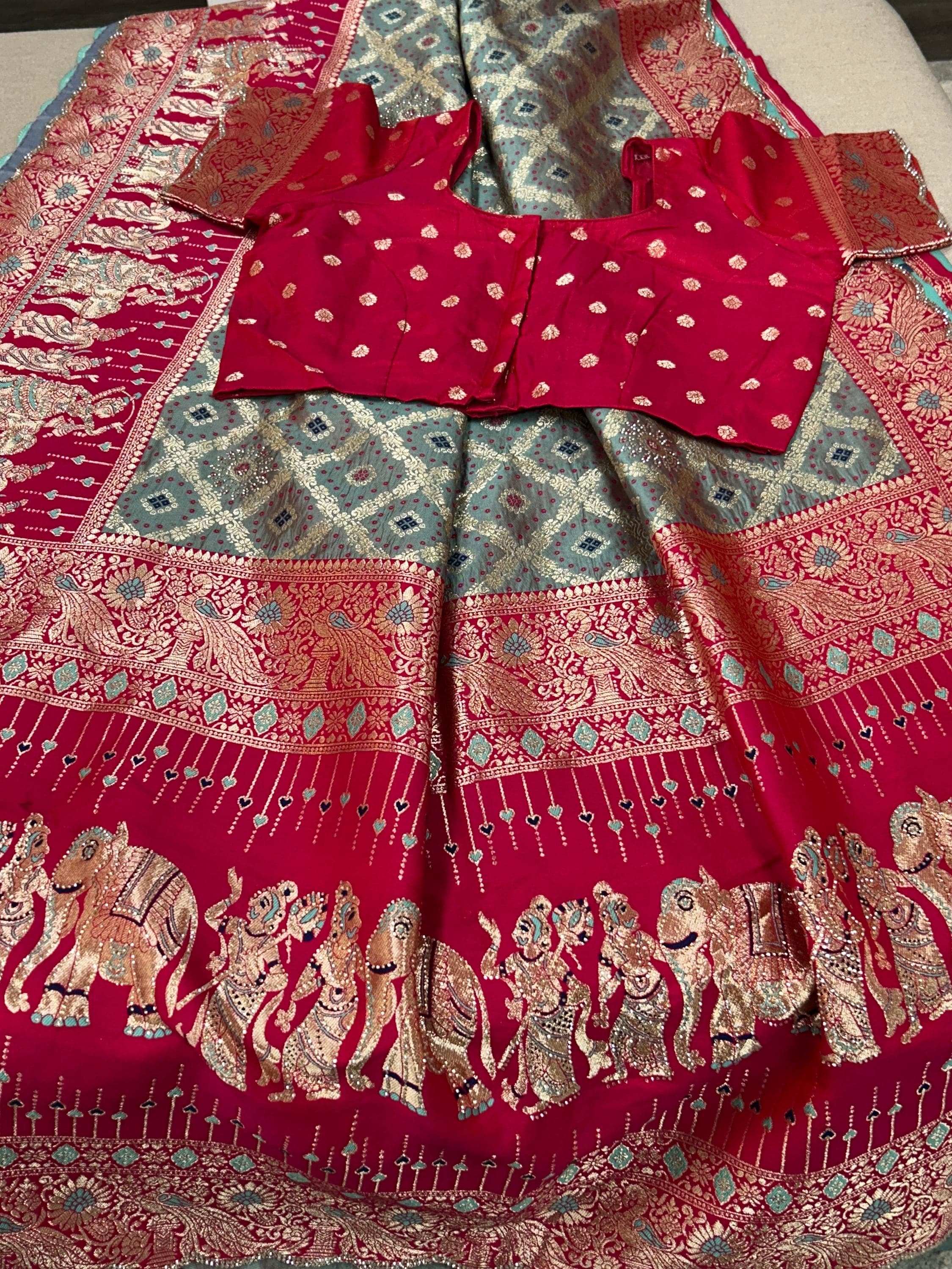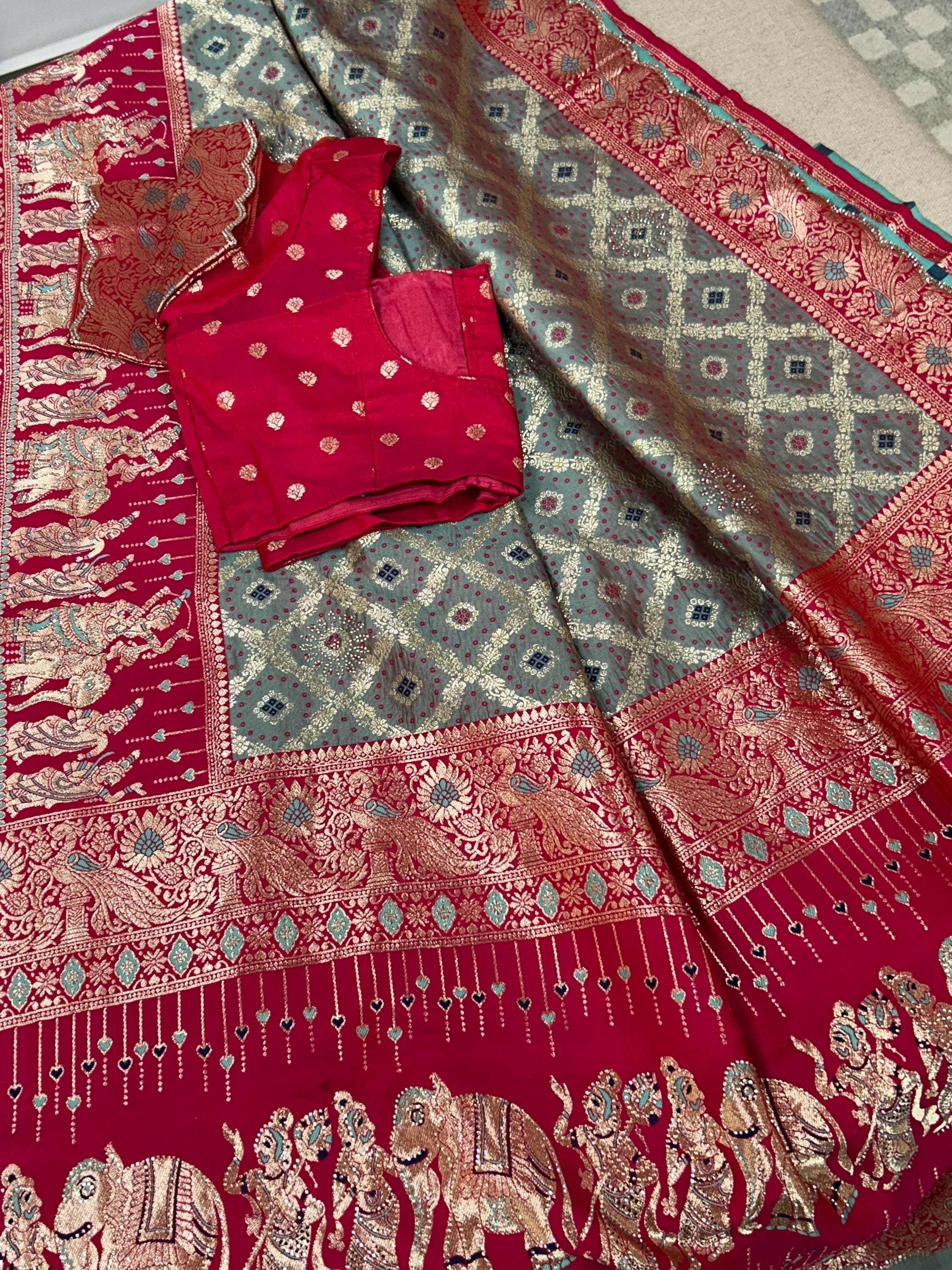 The Banarasi silk saree features an elegant grey-pink color combination, enhancing its aesthetic appeal. It comes with a ready-to-wear blouse for convenience and is fall pico ready, ensuring minimal preparation time. This garment combines traditional craftsmanship with modern usability, making it suitable for various occasions.